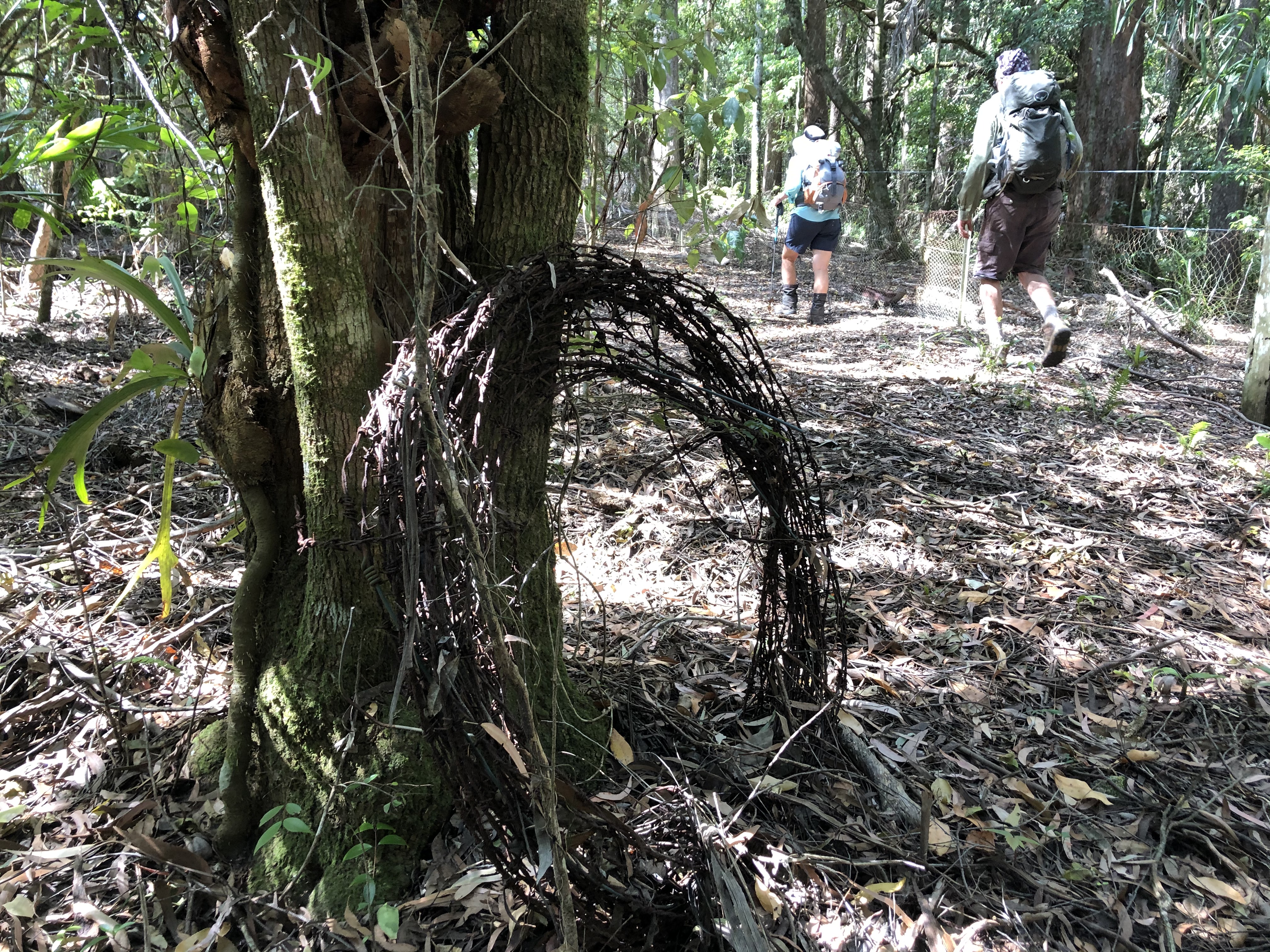 Day 3 (Approx.16km) After a hearty breakfast and a fond farewell we retrace our steps from the previous afternoon and greet our now-familiar Fence. This part of the trail is adjacent to Lever’s Plateau in the Border Ranges NP and small sections of Chinghee NP on the Queensland side. Long Creek rises here and on our way we pass the cascades and ravines of Long Falls. Our rollercoaster walk continues with many knolls and saddles to cross however we are loosing altitude all the way down to the Lion’s Road on the Qld/NSW Border. Spectacular views open up to the east as we enter the cleared farmland overlooking Running Creek Road and the Brisbane – Sydney Railway line far below us. Shortly before we end our long walk we cross the railway tunnel beneath the mountain. The Fence continues on past Mount Gipps from Richmond Gap however we will farewell it here and board our van for the return trip to Boonah.